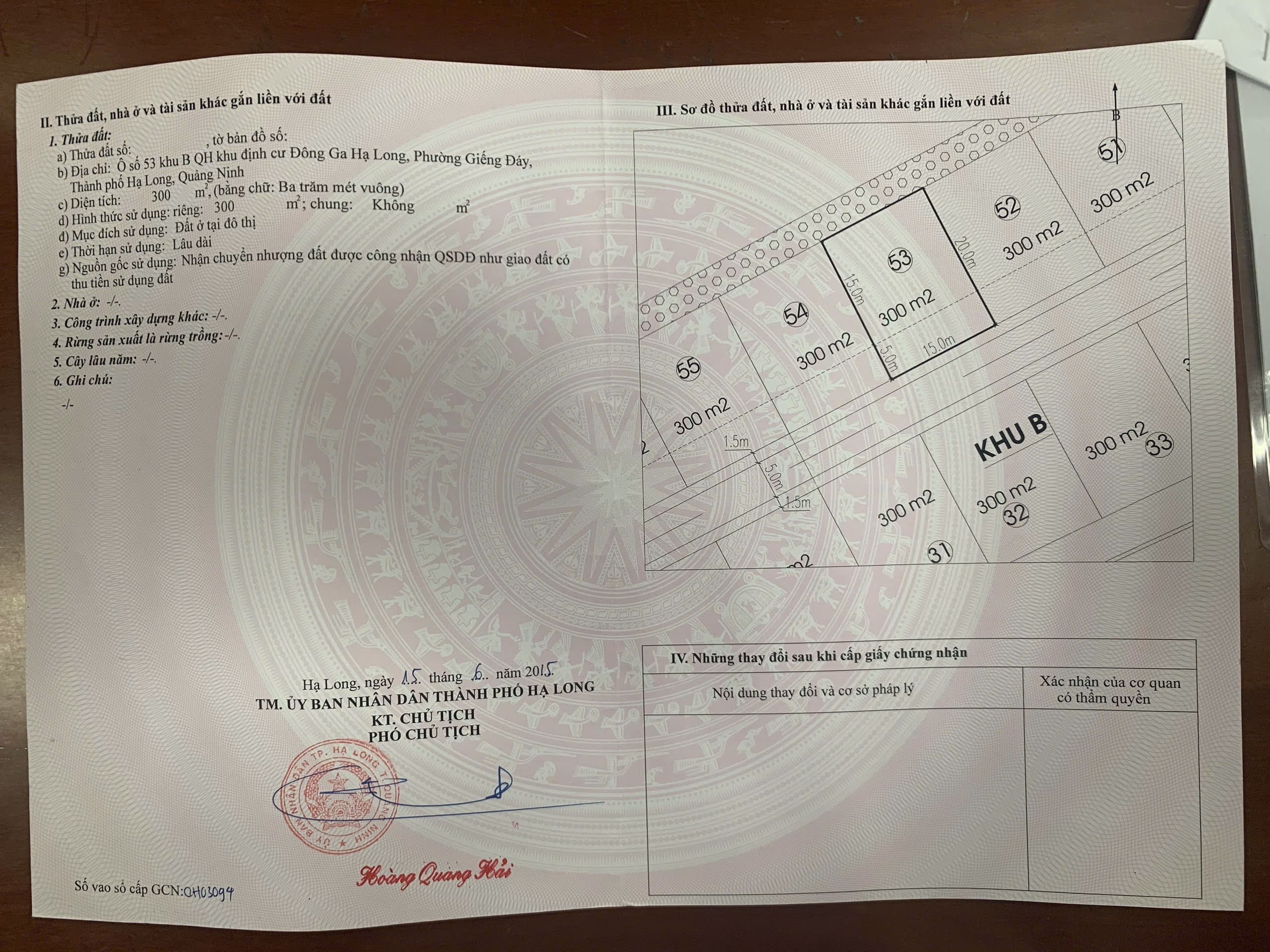 300m2, SĐCC , MT 15m , hướng ĐN , đường rộng 5,5m , khu vực dân cư đông đúc , gần chợ , gần trường học , cách bệnh viện BÃI CHÁY 500m